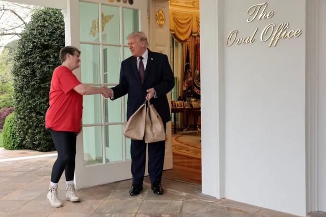 当地工夫4月13日,好意思国总统唐纳德·特朗普在白宫西翼的门口,领取了他的麦当劳外卖,被称为“外卖奶奶”的送餐员莎伦·西蒙斯为他送来了芝士汉堡和薯条。