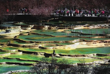 搭客集会在黄龙景区五彩池前不雅赏梯湖彩池好意思景。图据新华社客户端