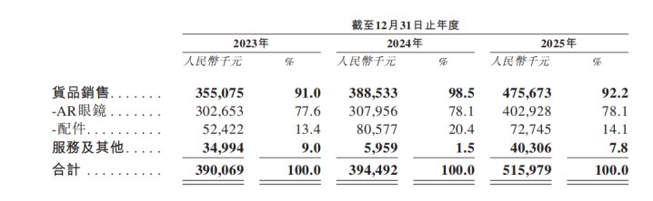 XREAL的收入来自AR眼镜销售、配件销售和时刻劳动,其中公司九成以上的收入齐来自AR眼镜的销售。2025年,公司总营业收入5.16元,其中AR眼镜销售收入4.03亿元。