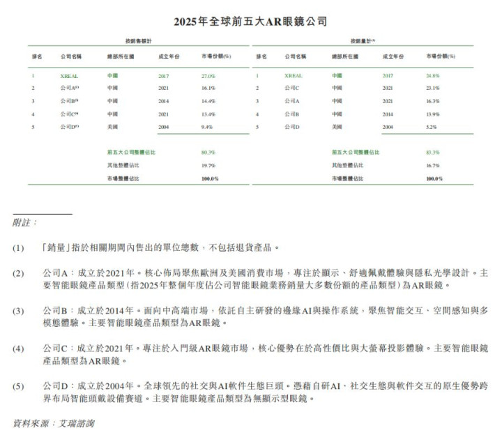 据艾瑞连系尊府,2025年,全球AR眼镜商场仍相对集结,前五大品牌共计占销售收入总和的80.3%。在全球前五大AR眼镜公司中,前四家齐来自中国,有一家来自好意思国。