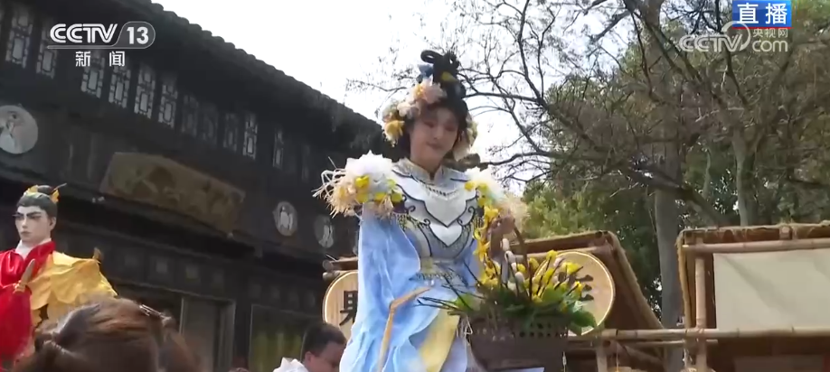 看完水上的精彩巡游,岸边的轧蚕花习气互动更是淆乱超卓,尽是烟火气。踩着高跷的蚕花仙子正穿梭在东谈主群中,为现场旅客派发蚕花。