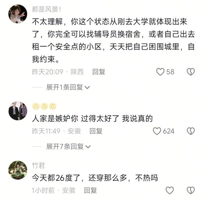 说真话,我看着她视频里干巴巴的模式,少许大学生的朝气齐莫得,确凿挺苦闷的。你说咱们拚命念书,到底是为了啥?不即是为了过得温暖少许吗?如若念书读到天天样子崩溃,那这书不念又能如何?难说念非要按别东说念主的期待活,才算不滥用东说念主生吗?