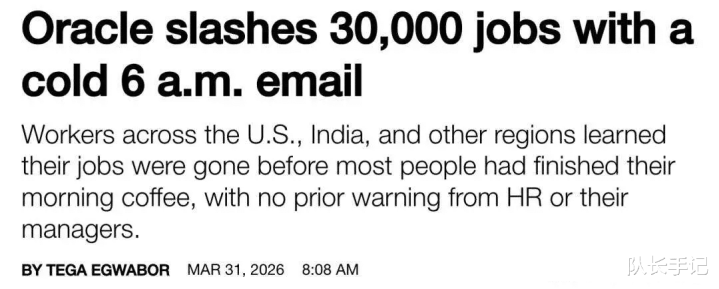 宇宙软件巨头甲骨文3月31日凌晨向职工群发邮件,通知运转新一轮大规模裁人,规模高达数千东谈主,触及工程、云服务、期间维持等多个部门,瞻望受影响使命岗亭最高或达到3万个!