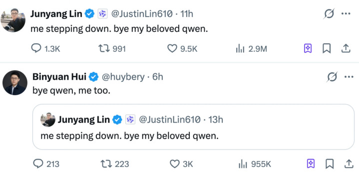 日前,阿里巴巴Qwen时候厚爱东谈主林俊旸在X平台自宣“告别Qwen"。随后,Qwen Code原厚爱东谈主惠彬原(Binyuan Hui)也转发了林俊旸的推文,称也已告别Qwen。而就在前一天,林俊旸在X上还转发了Qwen刚刚推出的系列小模子的推文,这一职位变动真的片刻。