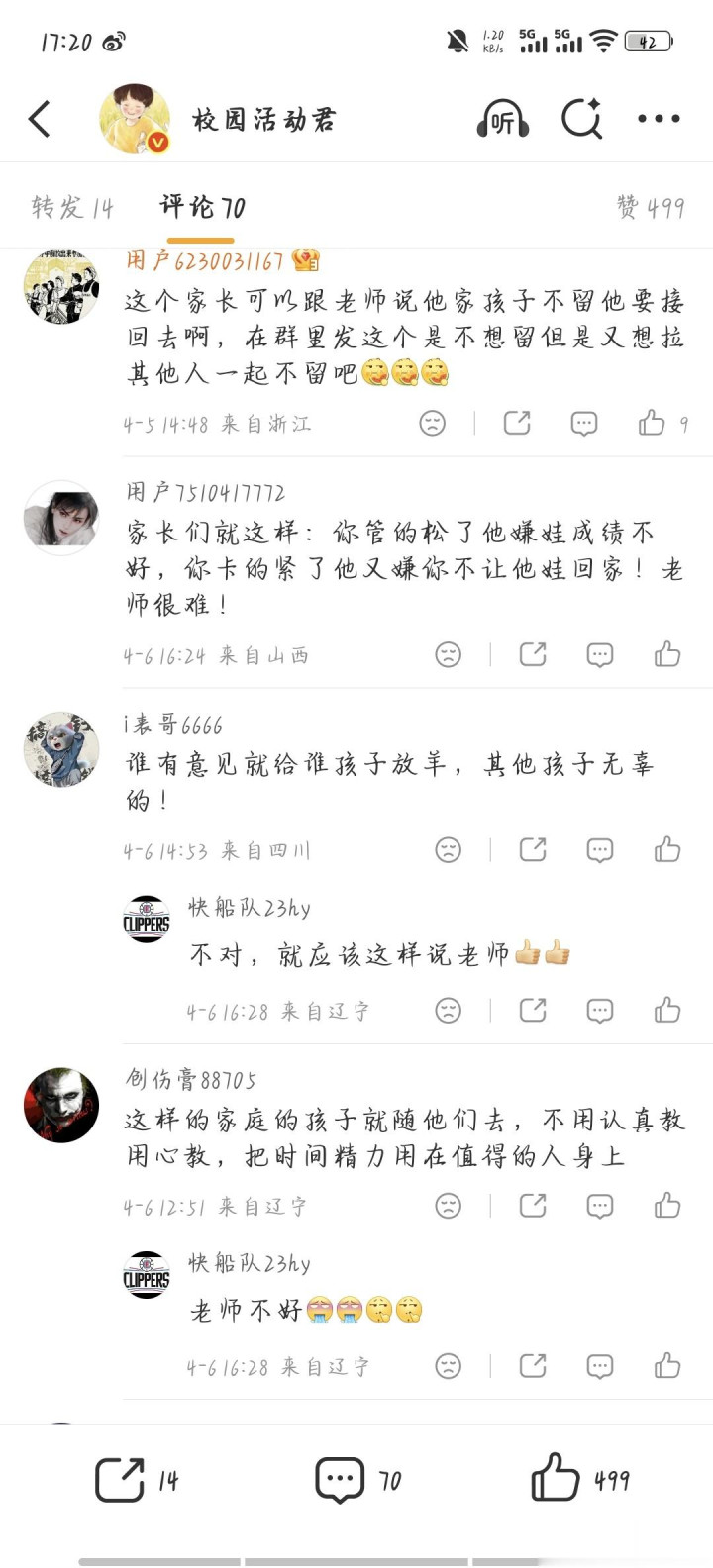我在念念,要是我是这个英语浑厚。从家长回话完这一句后,我就会让学生一说念出校门回家,从这一刻起,下课后我就坐窝离开课堂,一秒也未几作念停留。我只负责完成我的熏陶任务,除此除外一律齐与我无关。